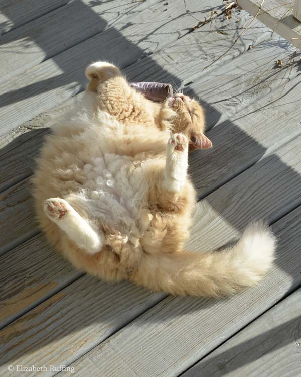 He guards our porch, but falls asleep on duty. He doesn’t like other cats to come up on our porch, which he sees as his personal sanctuary. A couple of them come anyway. One also looks in our door when he wants treats. The other runs away when Santana chases him. We don’t leave food out. We seem to have a social gathering location for cats.