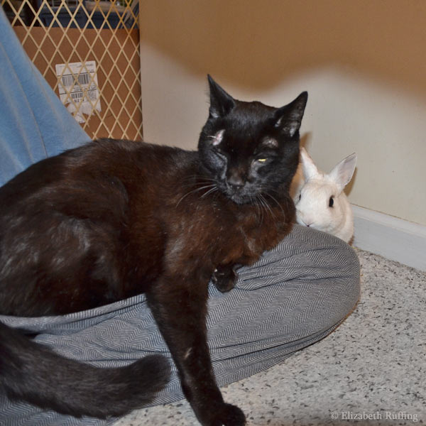 Sometimes, I go say hello to them, and Scooter runs ahead of me into his garage, begging for snacks. I decided to fix a couple of their toys I found there. They had a ripped-open catnip chipmunk and this lobster whose Velcro closure wouldn’t close up again. It made such a hit here, while I was trying to close it, that I am wondering whether I should try to make a pattern for one, or buy one online. The Velcro pouch was too small and didn’t work, and so making a new pattern would probably be better.